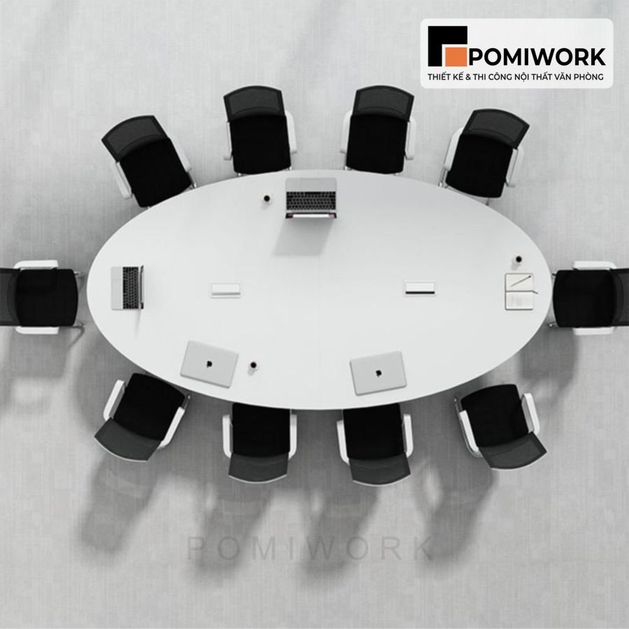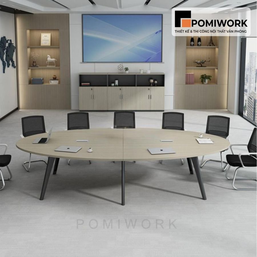Bàn họp văn phòng Oval dài – Mặt gỗ MDF, chân sắt hiện đại