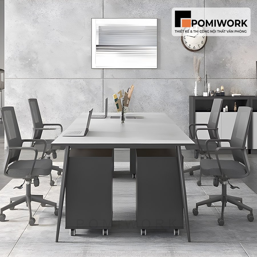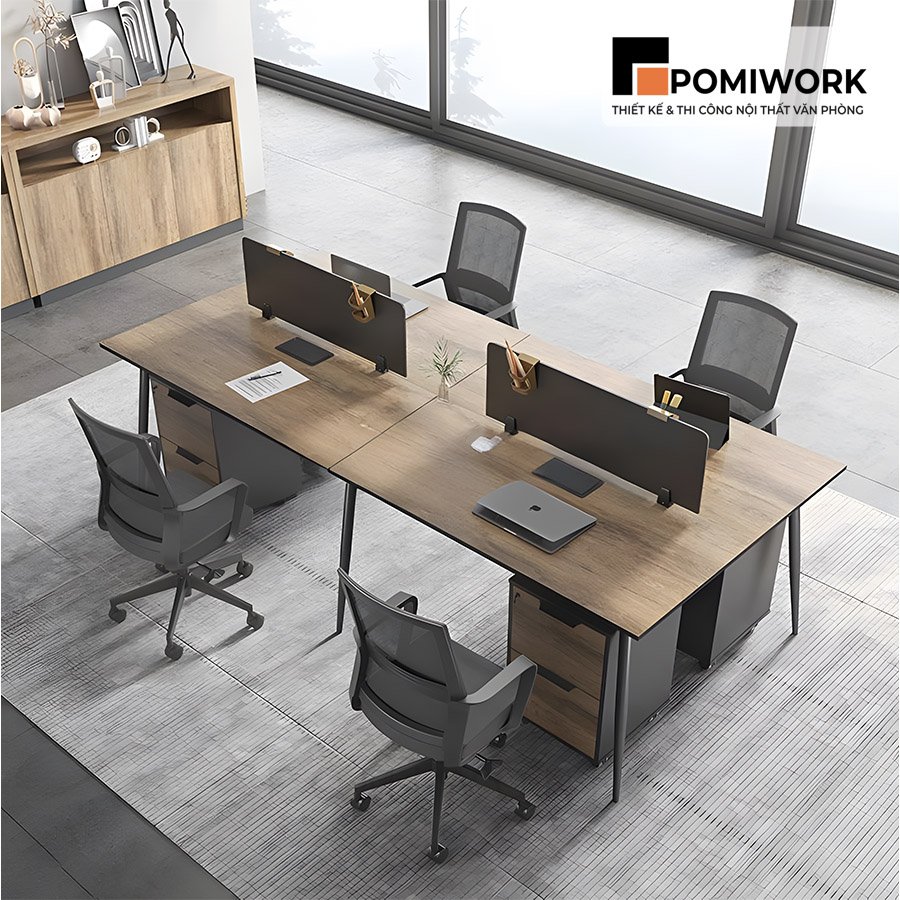 Bàn làm việc chung 4 chỗ ngồi thiết kế hiện đại, có hộc tủ tiện lợi