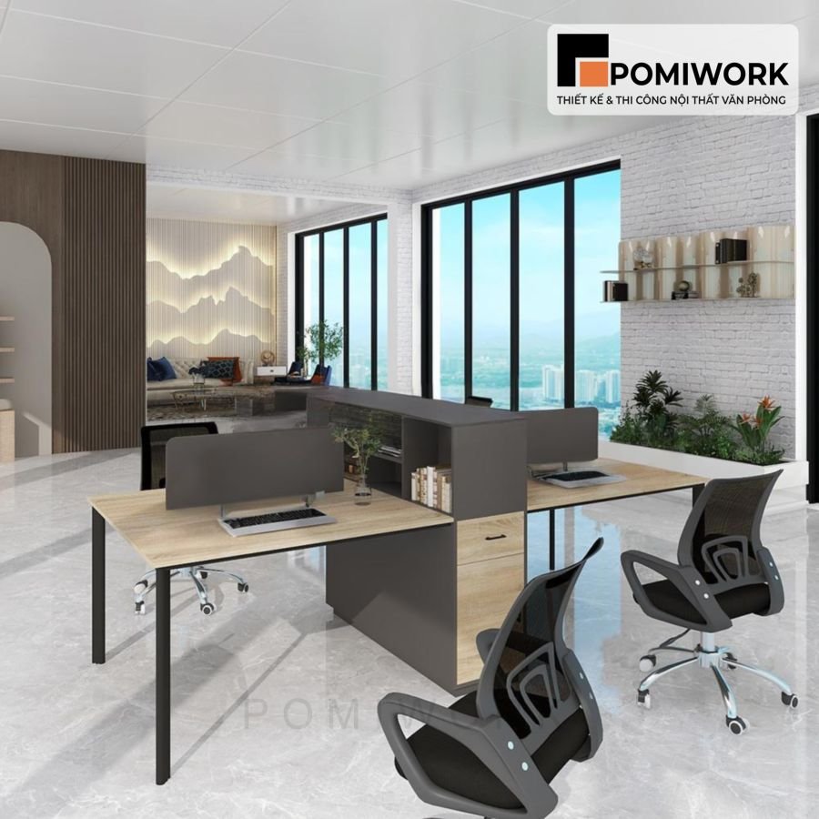 Bàn làm việc nhóm 4 người hiện đại – khung sắt sơn tĩnh điện, mặt gỗ sáng sang trọng