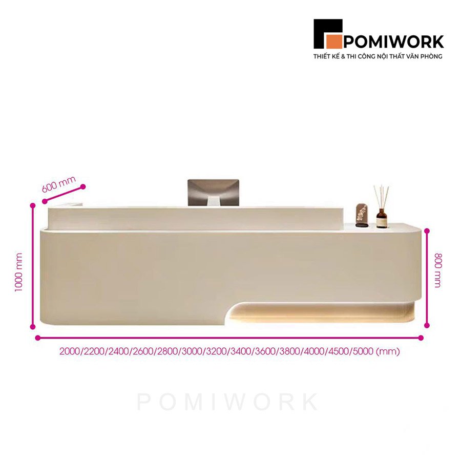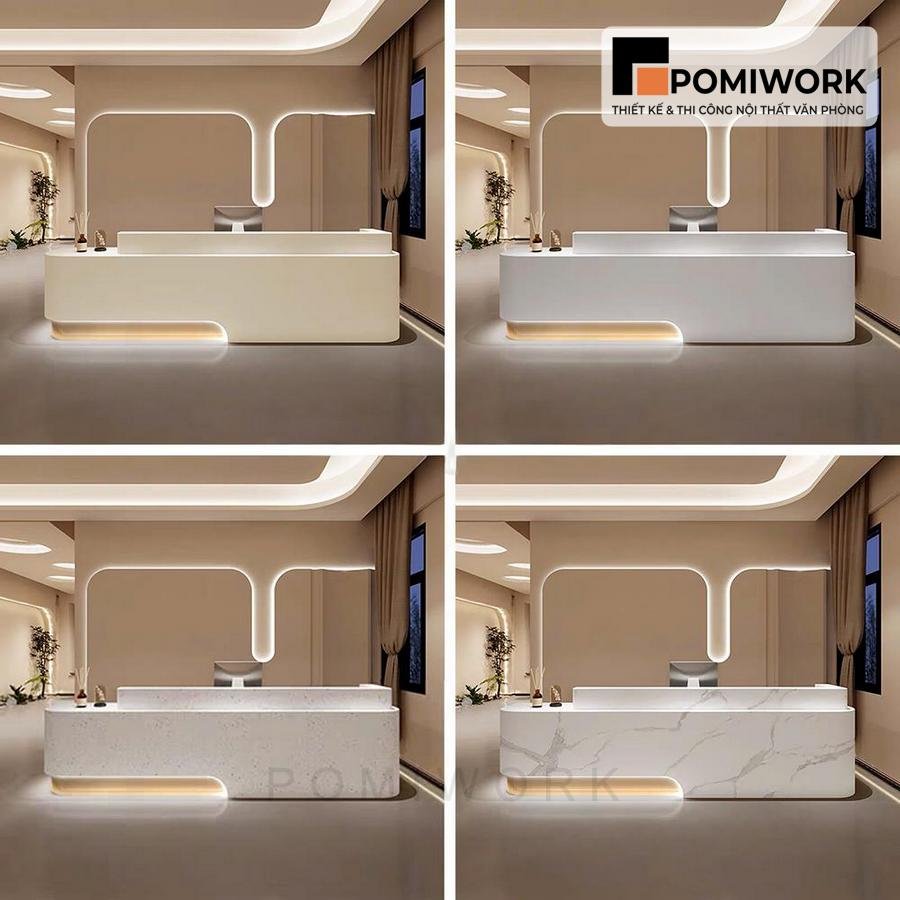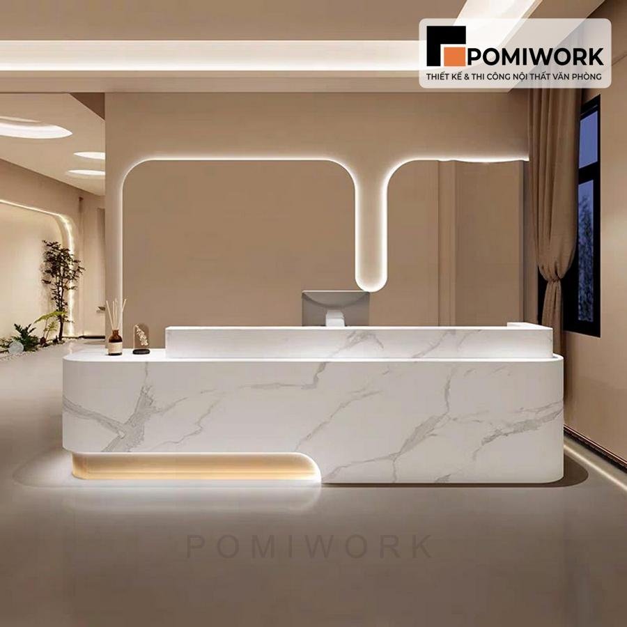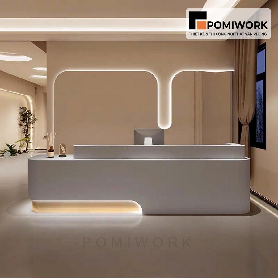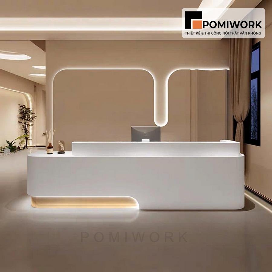 Quầy lễ tân bo góc mềm mại – Bàn tiếp tân kết hợp đèn LED hiện đại