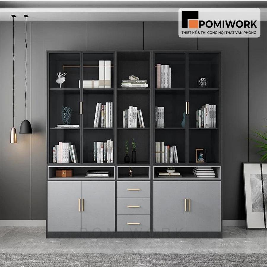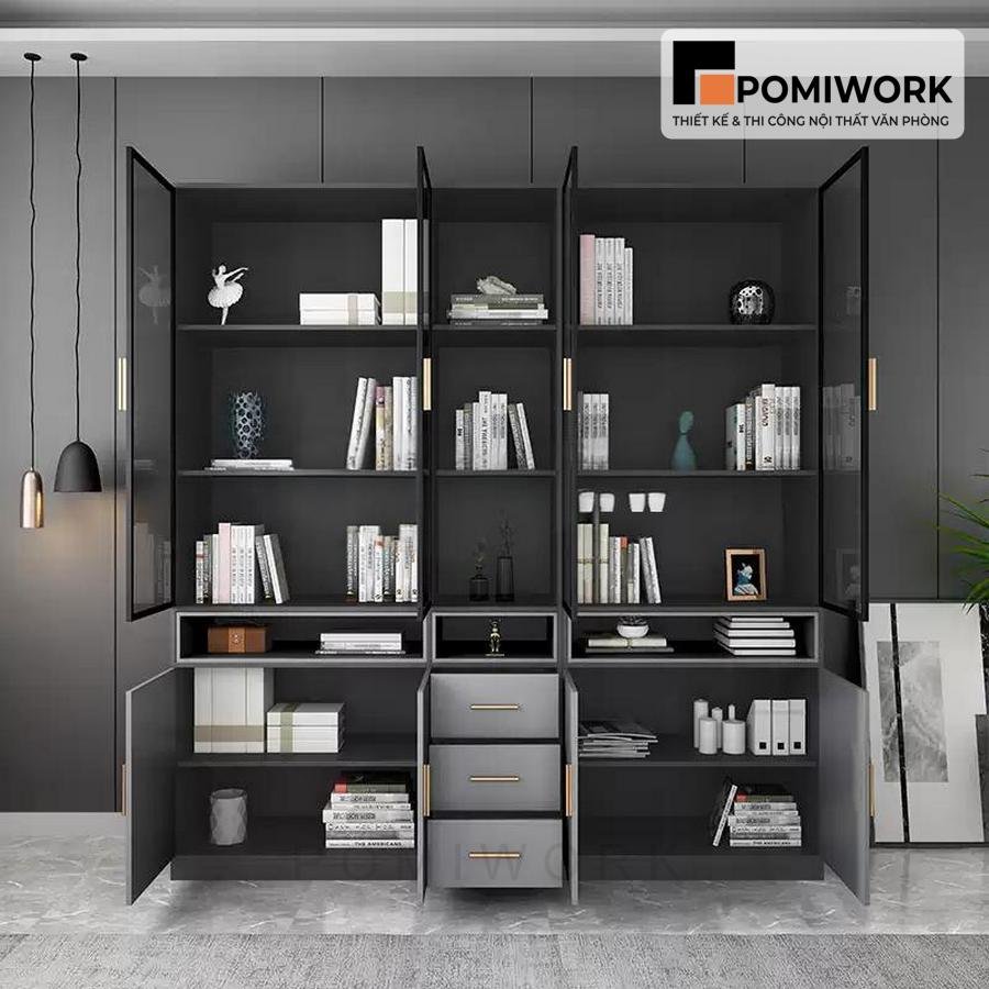 Tủ tài liệu gỗ MDF phối kính đen – Mẫu tủ hồ sơ sang trọng, hiện đại